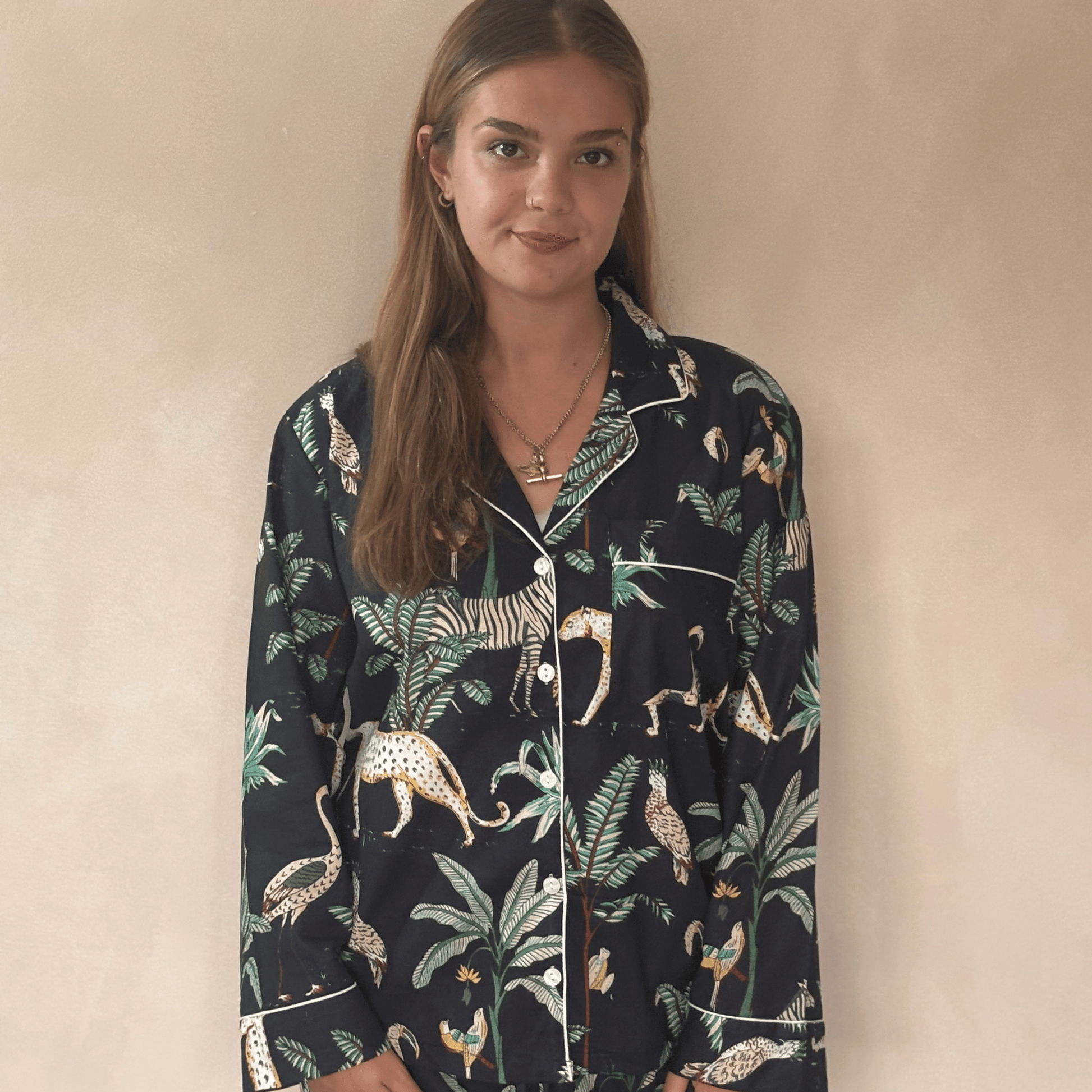 Black Safari Print Cotton Pyjamas. 100% cotton long-sleeved, full length pyjamas with straight leg. Trousers have an elasticated drawstring waist. Safari print featuring wild animals and foliage. White trim. Supplied in gift pouch.