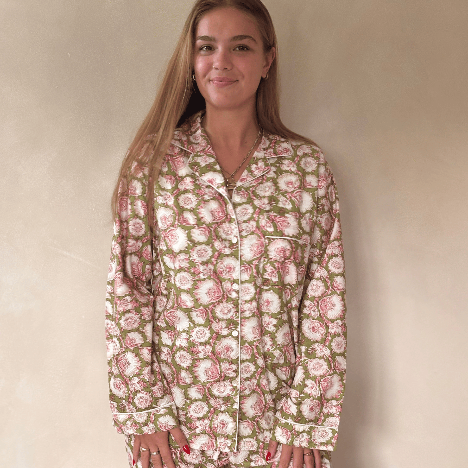 Green and Pink Flower Print Cotton Pyjamas. 100% cotton long-sleeved, full length pyjamas with straight leg. Trousers have an elasticated drawstring waist. Colourful pink flower design on green background with white trim. Supplied in gift pouch.