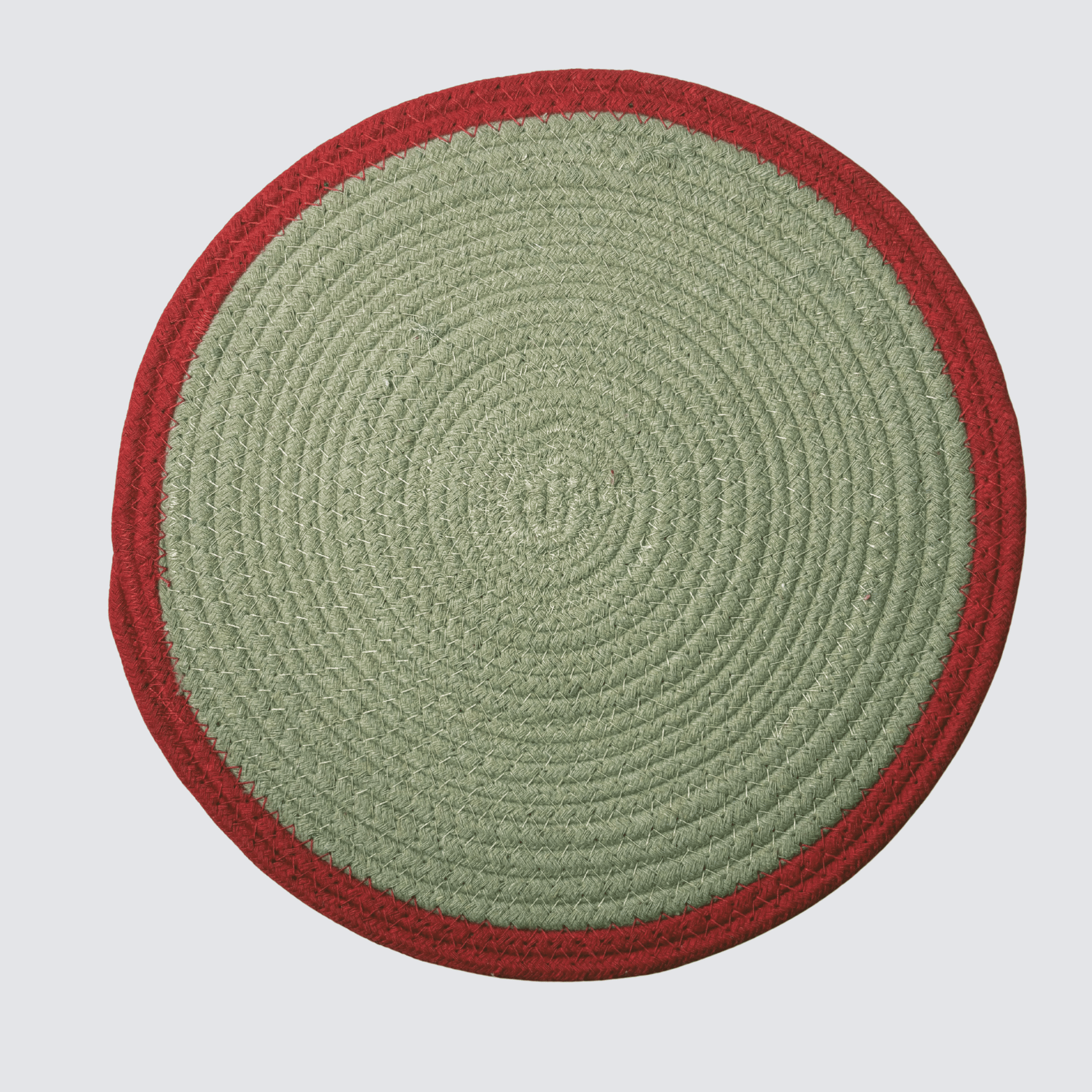 Handwoven rope cotton placemat in red and beige. Stylish handwoven rope cotton placemat made by artisans in India using sustainably farmed cotton. The colourful border is visible under a standard size dinner plate. These handwoven rope cotton placements can be used for indoor or outdoor dining and are perfect for use with a vase. These items are handmade and there may be slight, pleasing variations.
