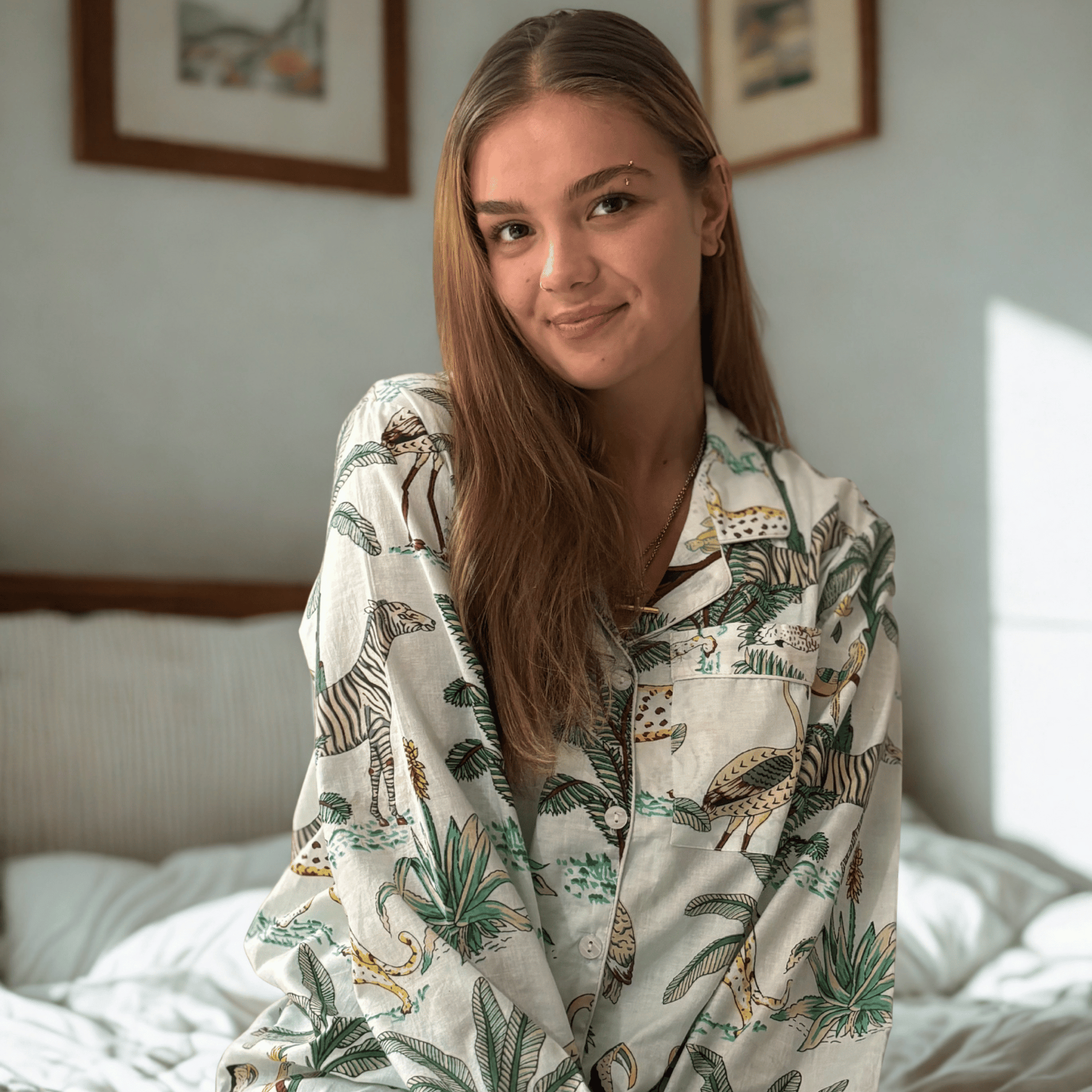 100% cotton, long-sleeved, full length pyjamas with straight leg. Trousers have an elasticated drawstring waist. Safari print featuring wild animals and foliage. White trim. Supplied in gift pouch.